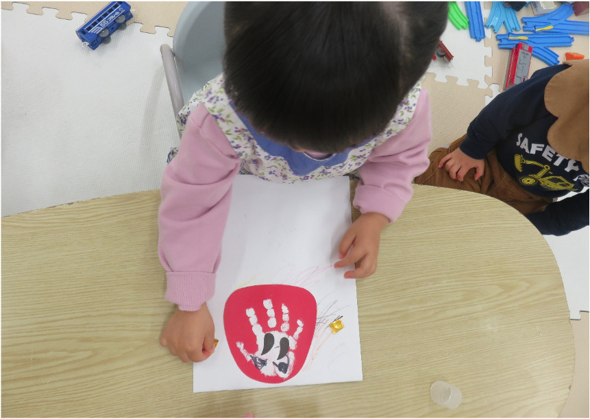 と嬉しそうに見せてくれました♪いろんな色を使い、思い思いに楽しんで描く姿がありました。次に、ダルマの形に切り取った赤の画用紙に白の絵の具で手形をつけました!そして、目とひげを子どもたちに貼ってもらいました。